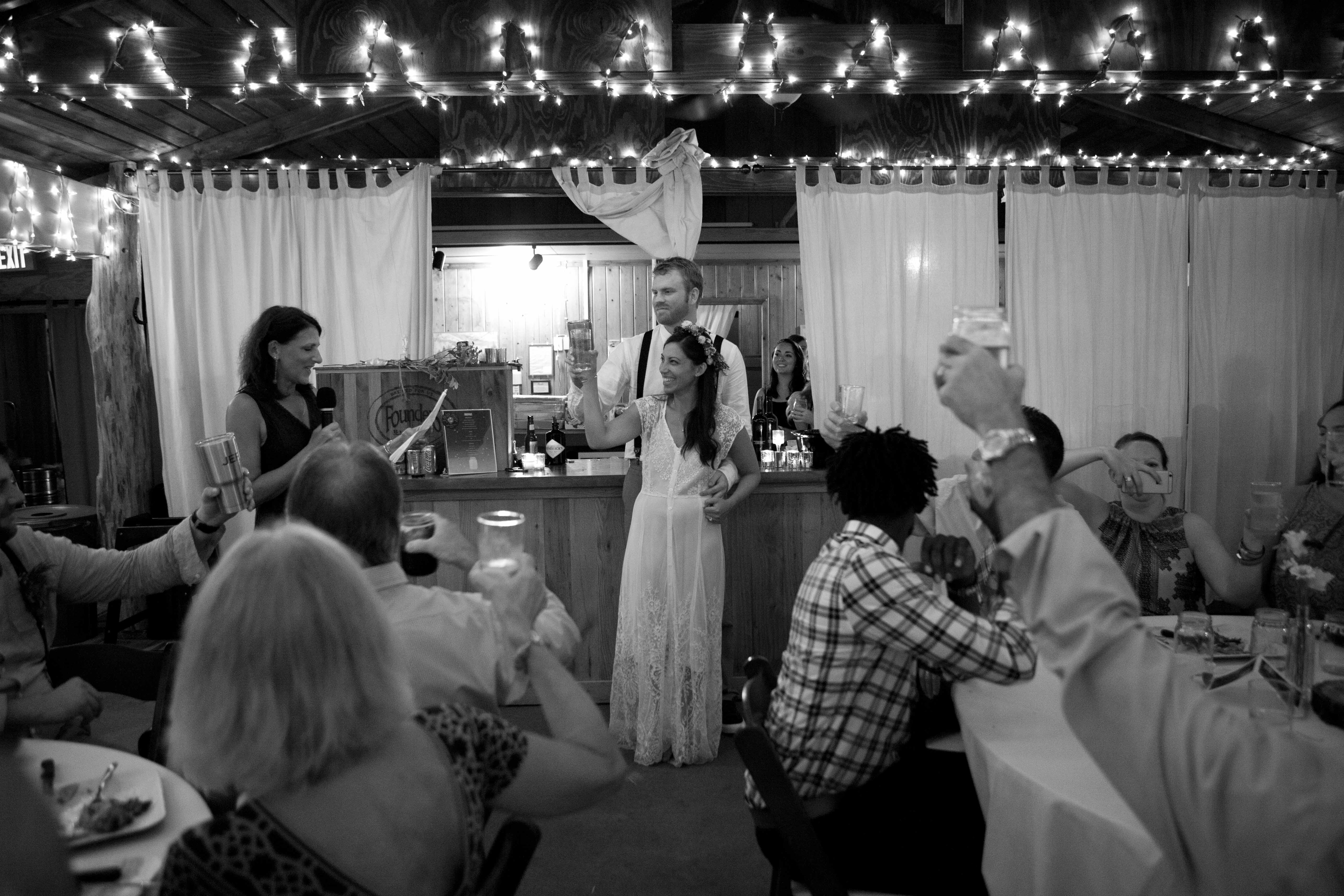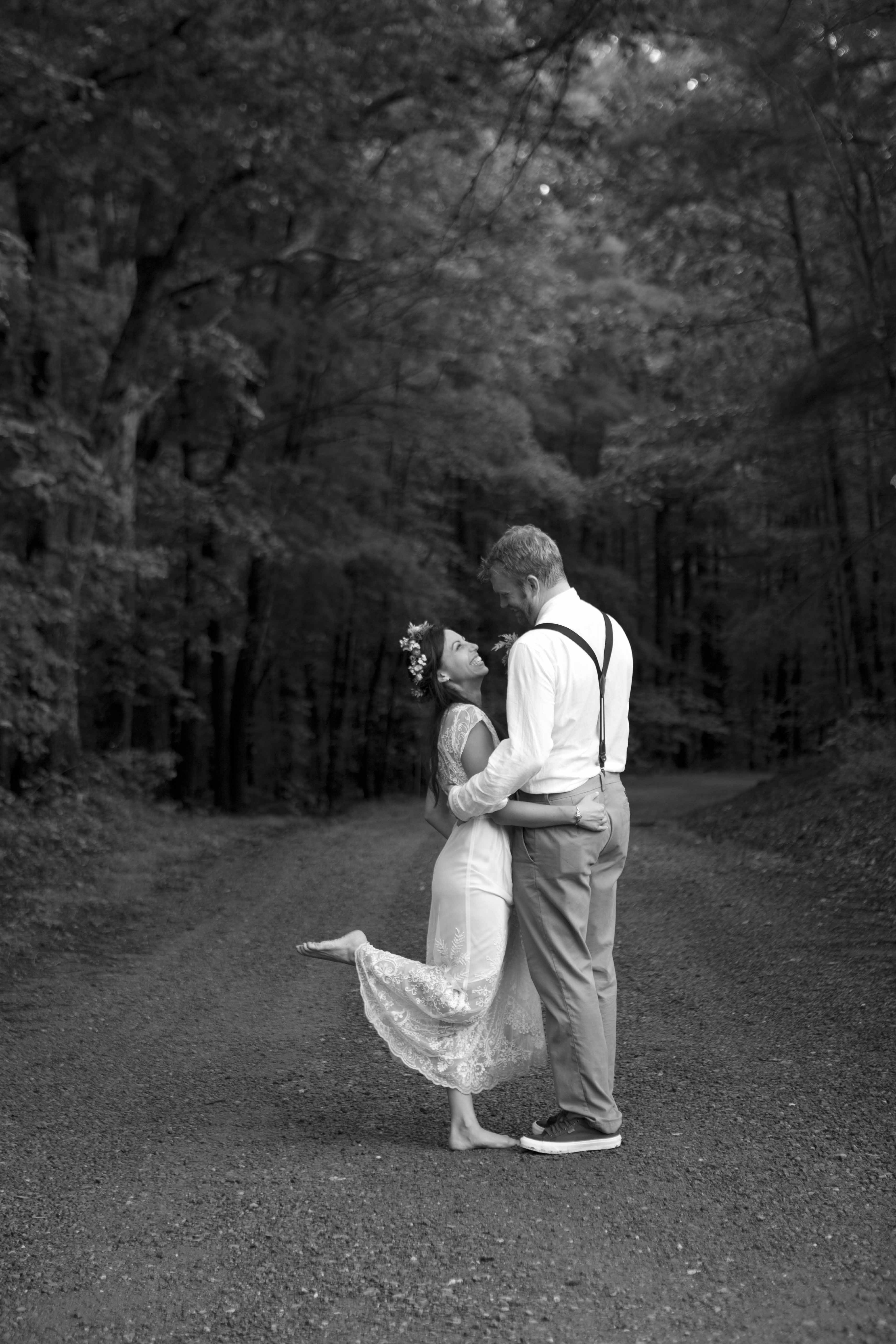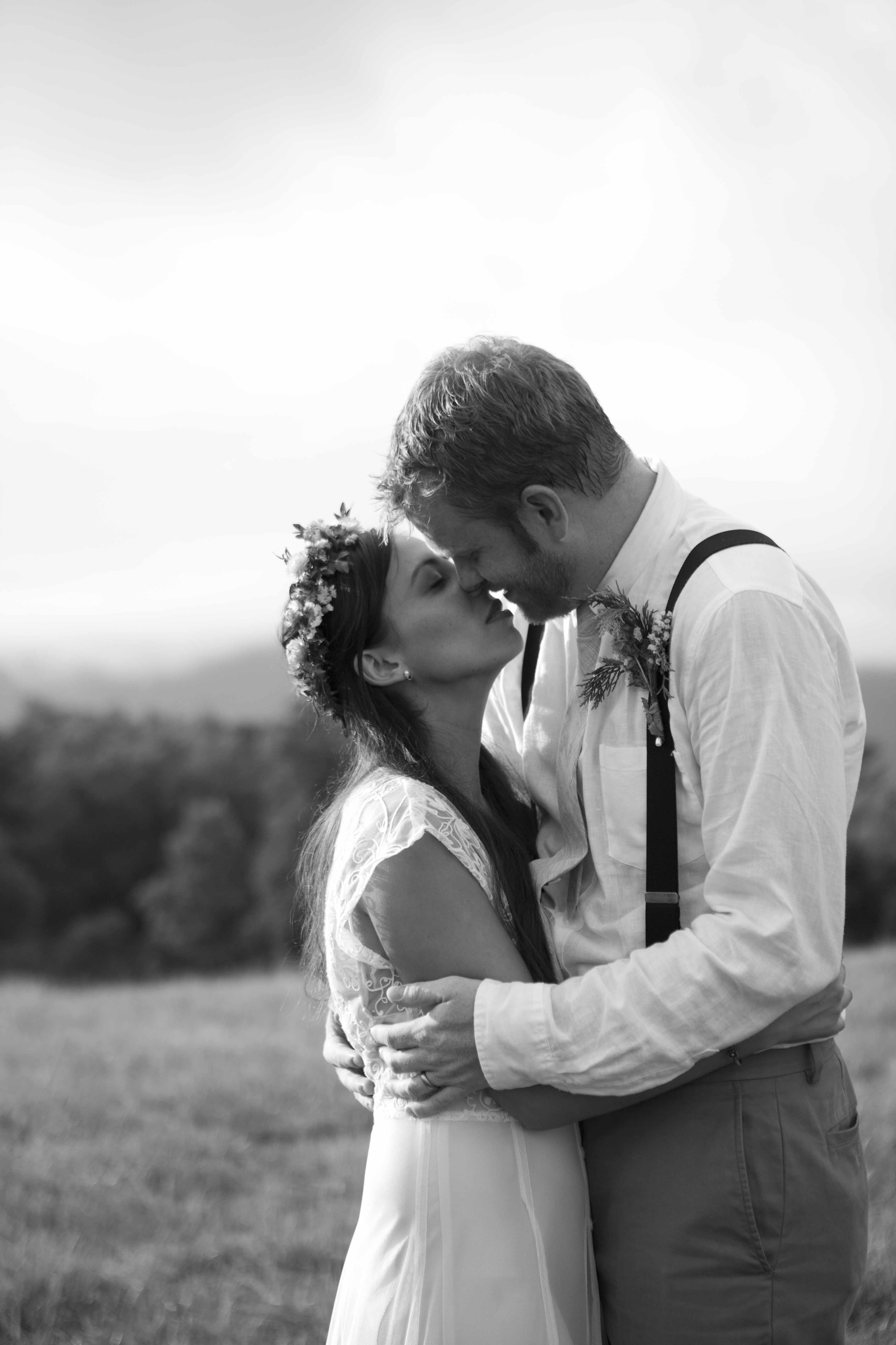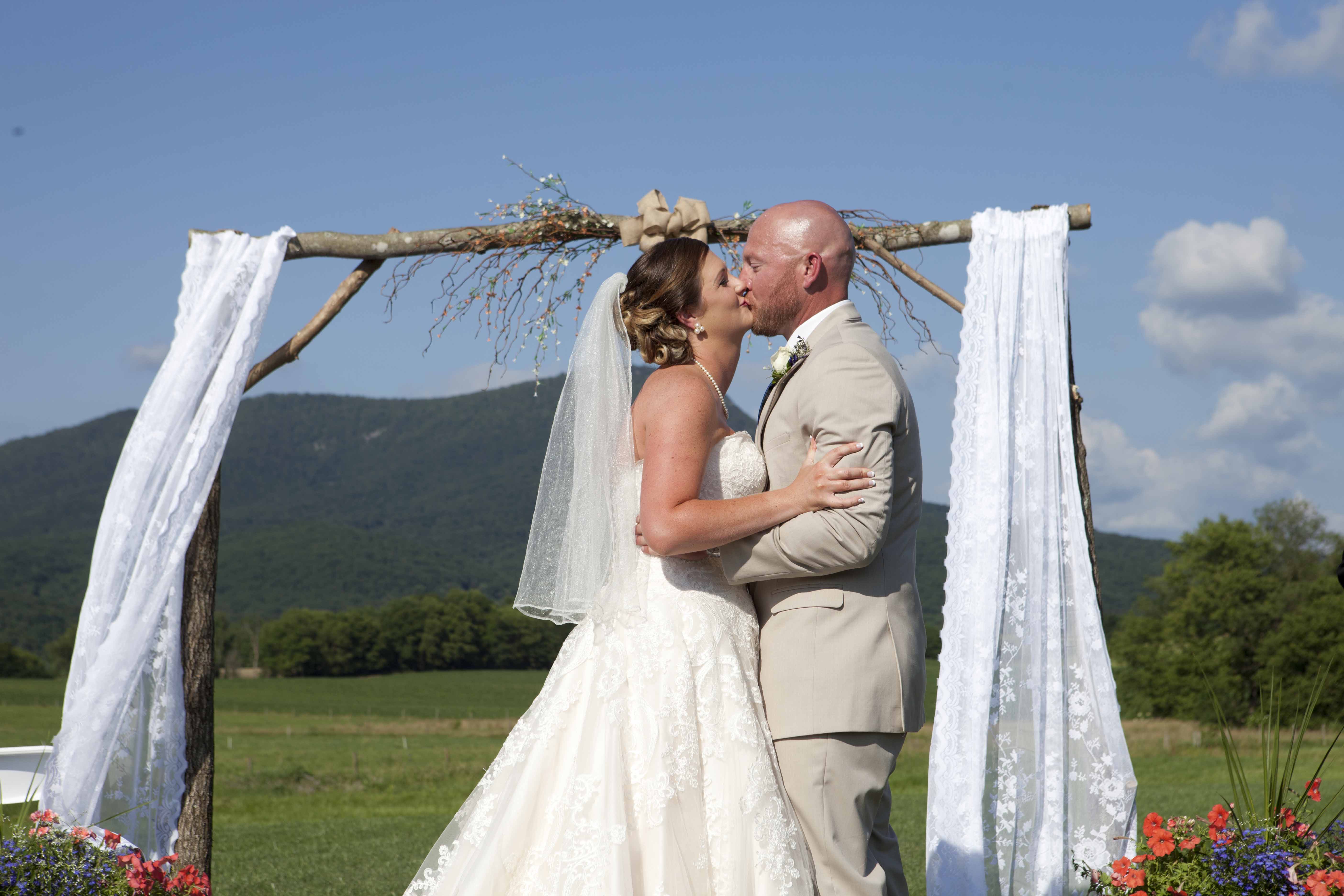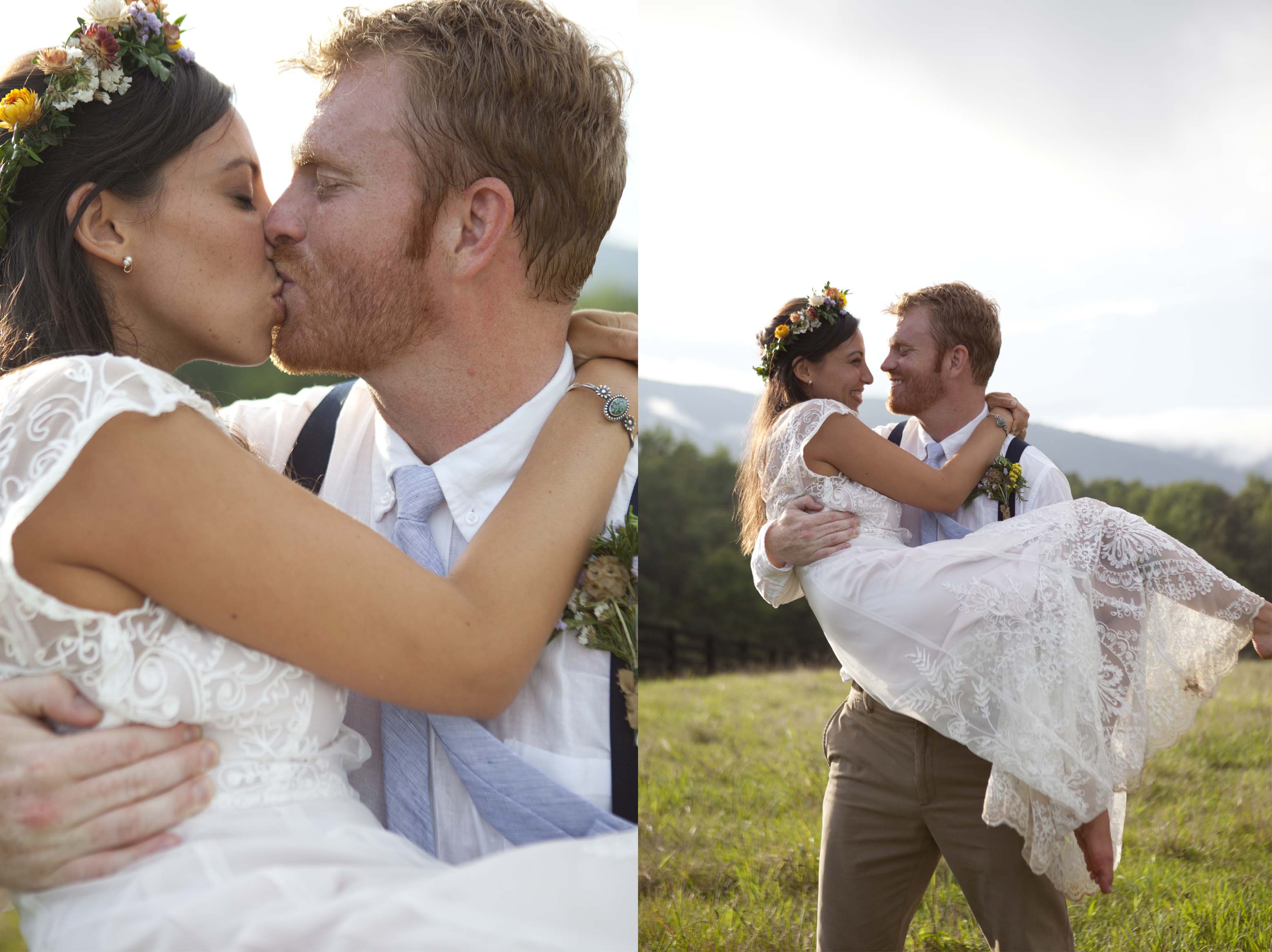 Jason and Allie invited their friends and family to celebrate their wedding day in a nature-lovers heaven. This lush oasis, Montfair Resort Farm, is tucked away in the mountains of Crozet, Virginia, just outside of Charlottesville. There was a calming peace over the whole event that not even a one hour rain delay could rattle. Guests joined together to witness Allie and Jason make sincere, tearful vows to each other while fog hugged the mountainous layers of blue behind them. Following a paper lantern-lit pathway through the woods led guests to cocktail hour where canoes were available for cruising and drinks were served in mason jars designed by Allie’s cousin. The reception was filled to the brim with personal touches of love. As I walked away that evening, sounds of dancing, laughter, music, and celebration under the canopy of trees faded into the distance behind me.