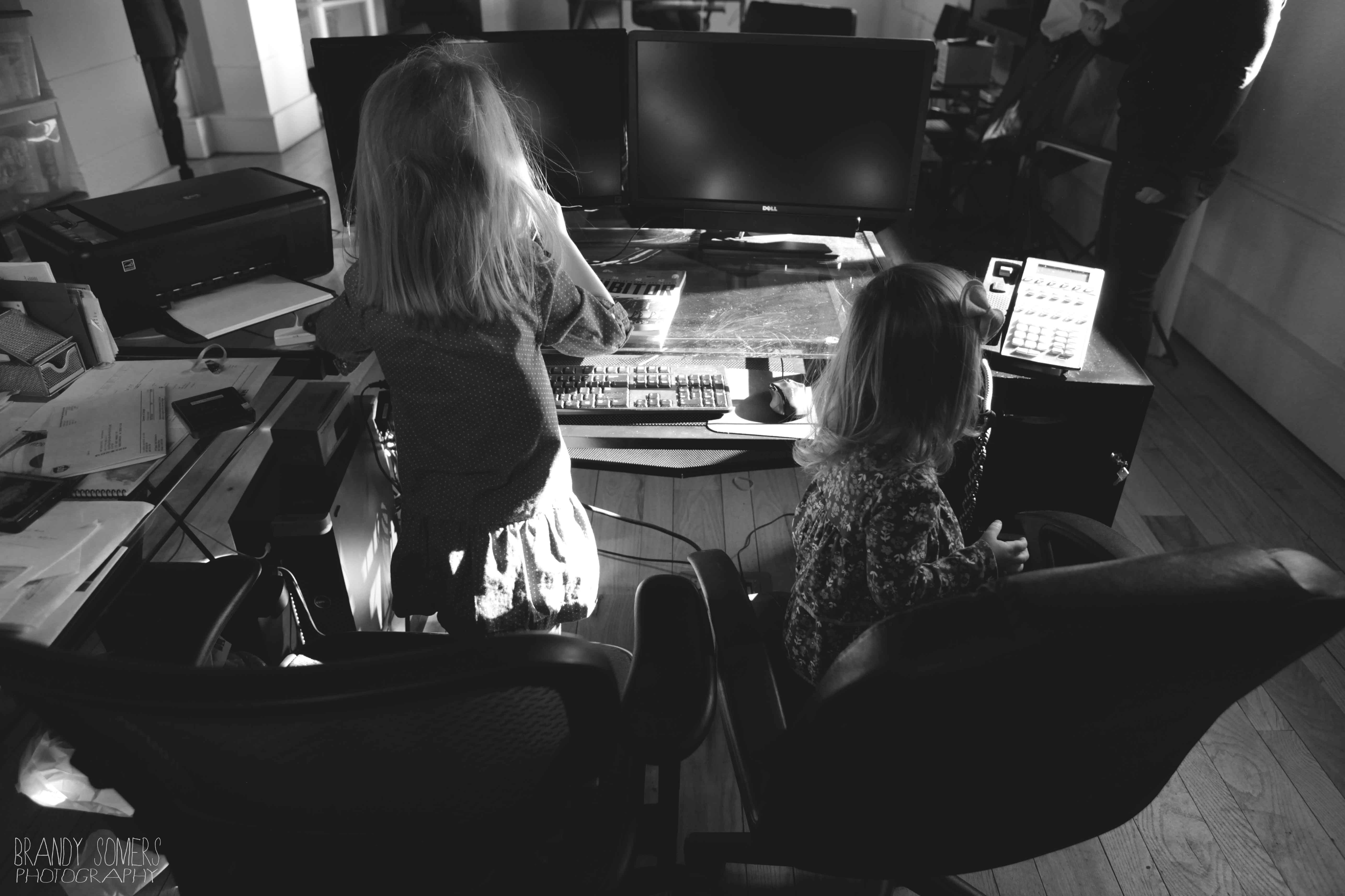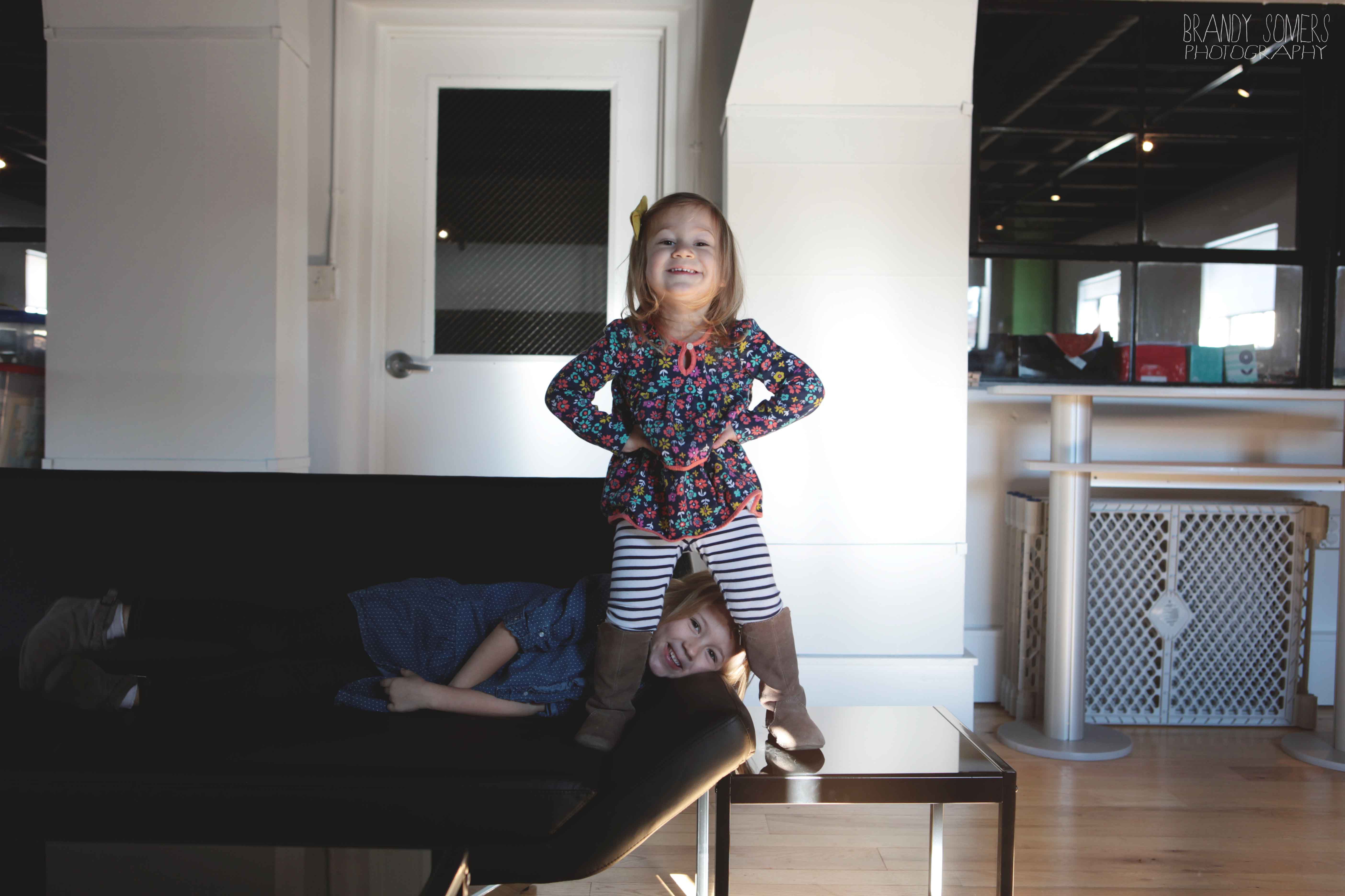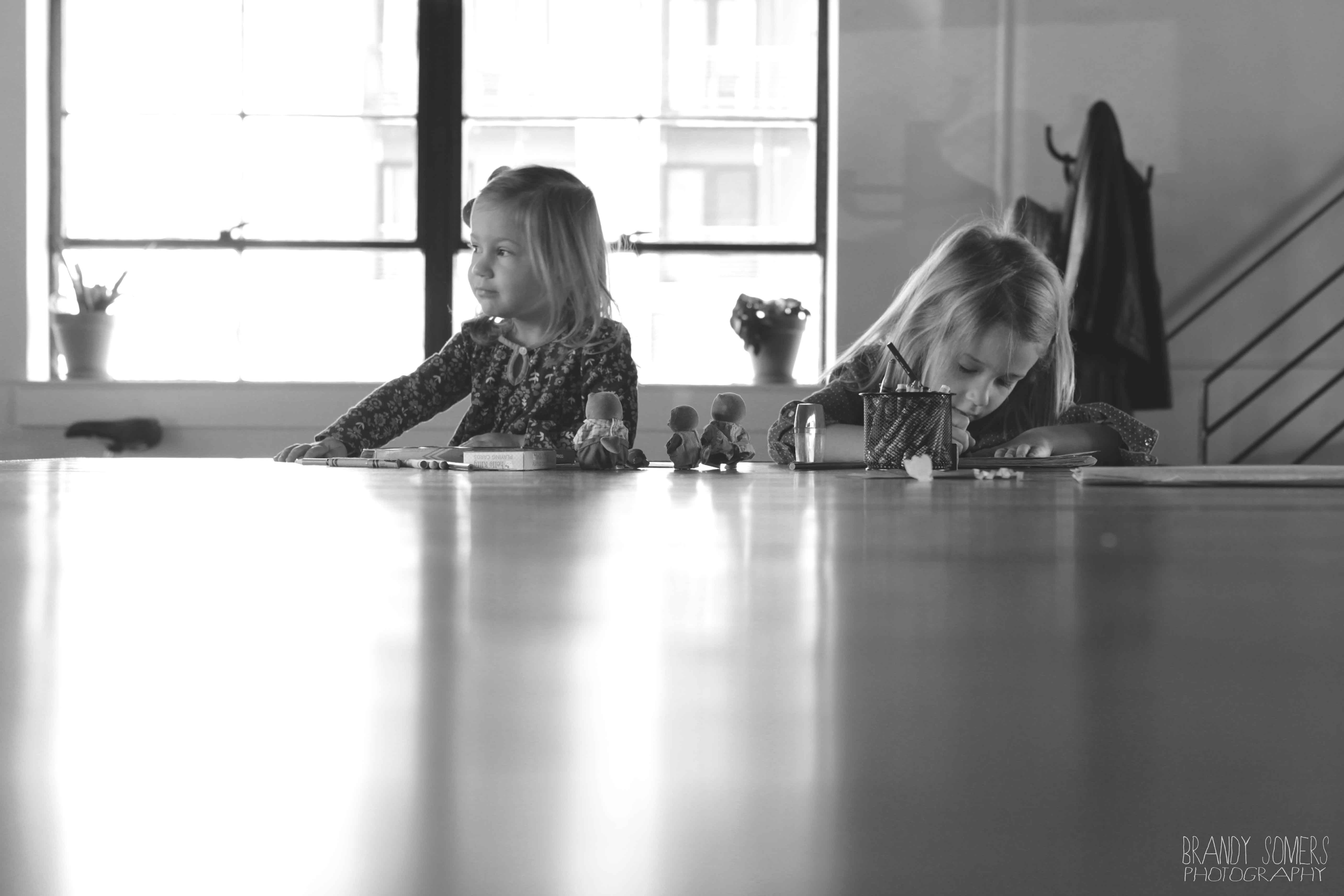 Personality is an understatement. These girls are full of life and entertainment. I met with the Hughes Sisters at MOD Displays in Downtown, Harrisonburg. Why meet at an office? Well this office is owned by the girl’s parents and it offered the perfect space for a mini-session. Lots of light. Lots of space. And perfectly stark to let little personalities bounce from wall to wall. When I arrived they were mid-coloring session but soon enough they were striking poses and showing me their human frog and dinosaur impressions. Oh what fun it is to be a kid! They invited me upstairs to “Daddy’s office” and gave me a crash course on how to run a business. From phone calls to keyboard…stuff to concentration faces to the max. At the end of the session they hopped back up to the table, grabbed their crayons and got back to work.